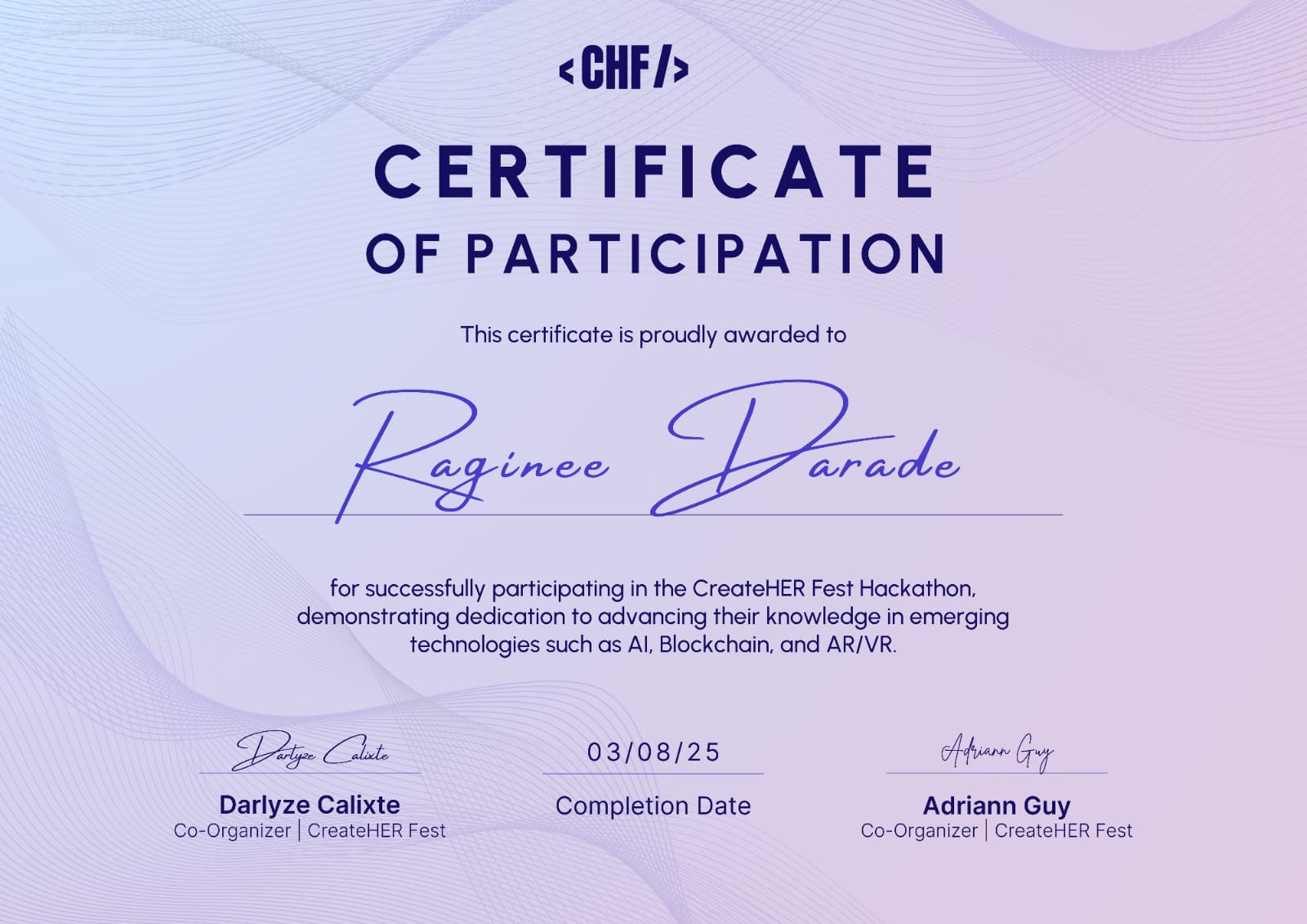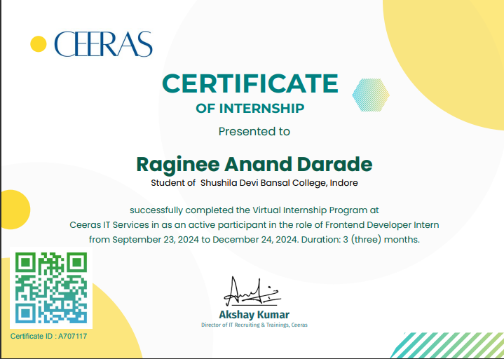 "Hello! I'm Raginee Darade, final year B.Tech student in Computer Science Engineering at Shula Devi Bansal College of Engineering. I have a deep interest in full-stack development, Python programming, and artificial intelligence. I am passionate about open-source contributions and actively participate in hackathons, where I showcase my skills and collaborate on innovative projects."